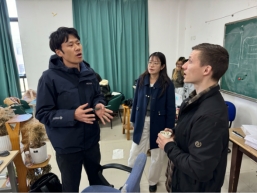 12月2日,评图焦点转向三年级建筑学专业。针对高年级学生的进阶需求,Reinders博士将指导重点放在设计深度打磨、可持续理念落地与汇报能力提升上。他延续去年“多维度考量设计要素”的核心观点,从流线优化、采光通风设计、环保材料选用等方面展开精准点评——既肯定学生方案中对“循环流线”的创新探索,也针对“窄廊与整体流线冲突”等问题,提出“拓宽通道、柱廊替代墙体”的实操建议;同时呼应“仪式感入口设计”理念,指导学生通过绿化点缀、台阶递进等细节营造空间体验。此外,博士还结合国际交流需求,梳理学生英语汇报逻辑,助力学子提升跨文化表达能力,为应对复杂设计任务积累经验。