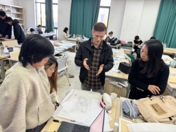 12月1日,Reinders博士率先走进建筑学一二年级一草评图课堂。面对初涉建筑设计领域的新生,他延续了严谨包容的教学风格,将去年强调的“场地适配性”理念进一步落地细化。从图纸规范的基础要求到设计概念的提炼方法,从云南本土自然环境与建筑形态的呼应逻辑到创意想法的可视化呈现,博士逐一拆解核心要点,通过具象案例分析,帮助学生破解“功能与形式脱节”“空间尺度把控不足”等常见难题。他鼓励新生大胆表达设计思路,借鉴德国“行动导向”教学中的互动理念,引导学生在互评互议中突破固有思维,建立“从需求出发,以逻辑串联”的设计认知,为后续学习筑牢根基。